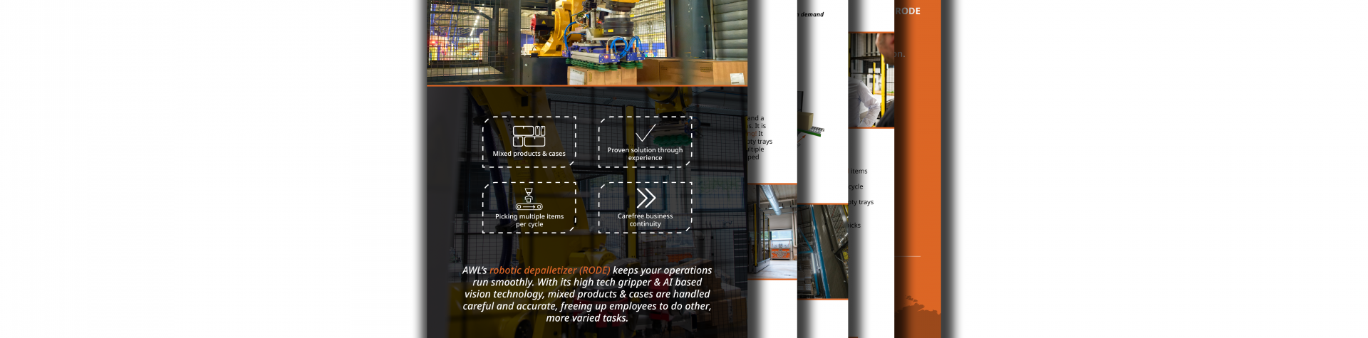 The combination of AWL’s 30 years of experience with robotic system integration and DHL’s knowledge of parcel handling resulted in: a robotic depalletizing solution for DHL Parcel in Rotterdam (the Netherlands). With this robot, DHL puts up to 800 parcels per hour on the sorting belt with a maximum weight of 31.5 kg. Integrating robot-controlled AI-vision and high-tech gripper technology makes it possible to pick random packages of various sizes and weights.